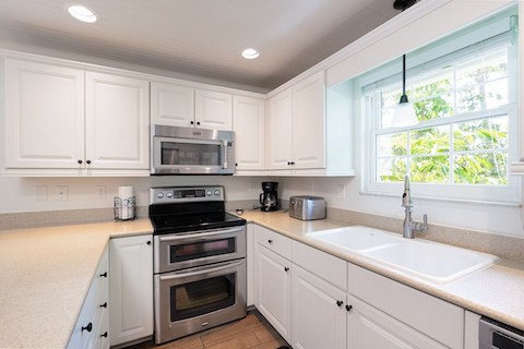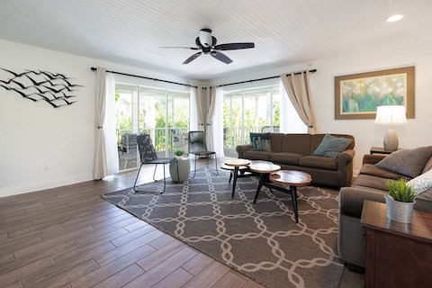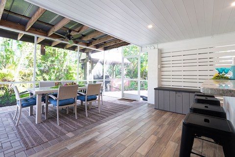 The yard is professionally and tropically landscaped with tropical coconut palms, mango tree, mandarine tree, and other tropical species. The back yard has an enclosed and private hot/cold outdoor shower. This custom home has new porcelain wood-shape floors throughout, LG washer and dryer, fast WiFi, smart speakers, and a separate newly renovated in-law suite. The fully equipped kitchen has granite counter tops, stainless steel appliances, a Keurig coffee machine, and a counter eating breakfast bar.